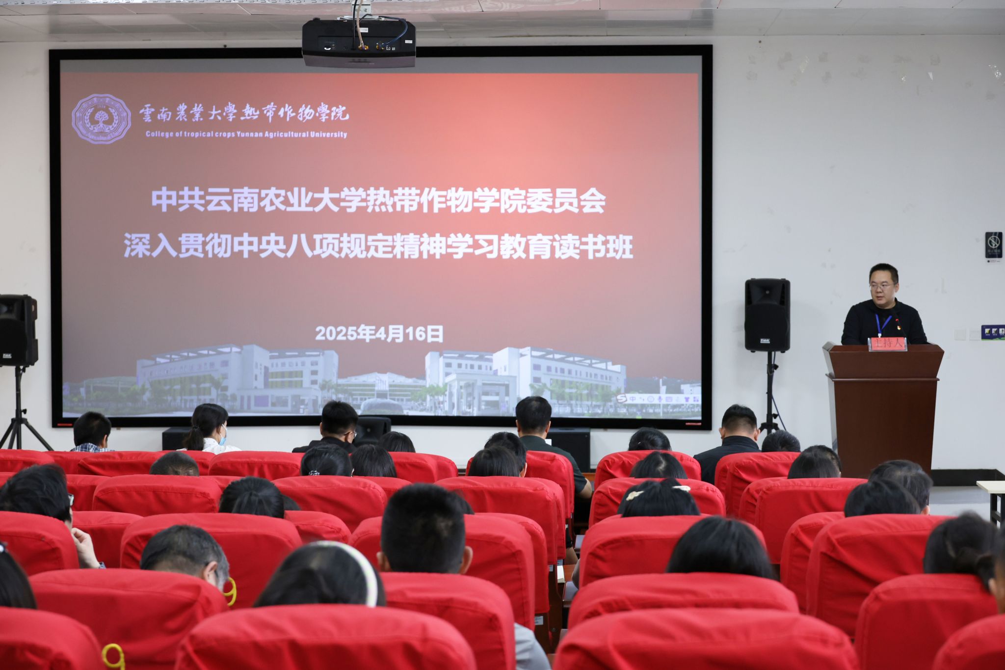 2025年4月16日,在深入贯彻中央八项规定精神学习教育读书班动员会上,热带作物bat365中文官方网站书记杜华波作开班动员讲话,并传达学校深入贯彻中央八项规定精神学习教育启动部署会议精神;纪委书记闫刚通报违反中央八项规定及其实施细则精神典型案例;党委组织员、工会主席周兴明组织学习《中共中央政治局贯彻落实八项规定实施细则》。