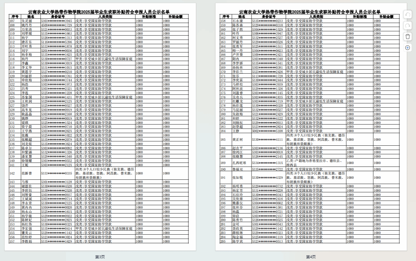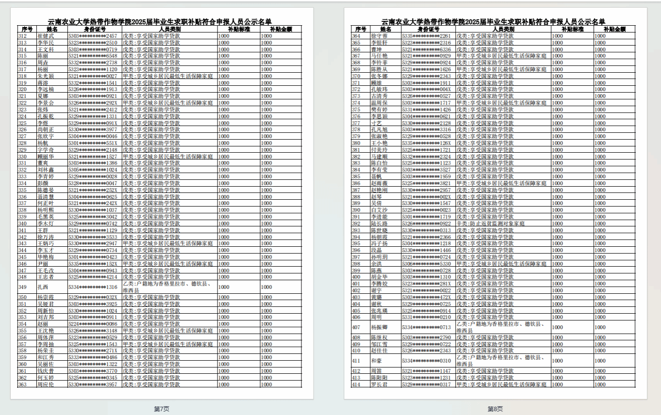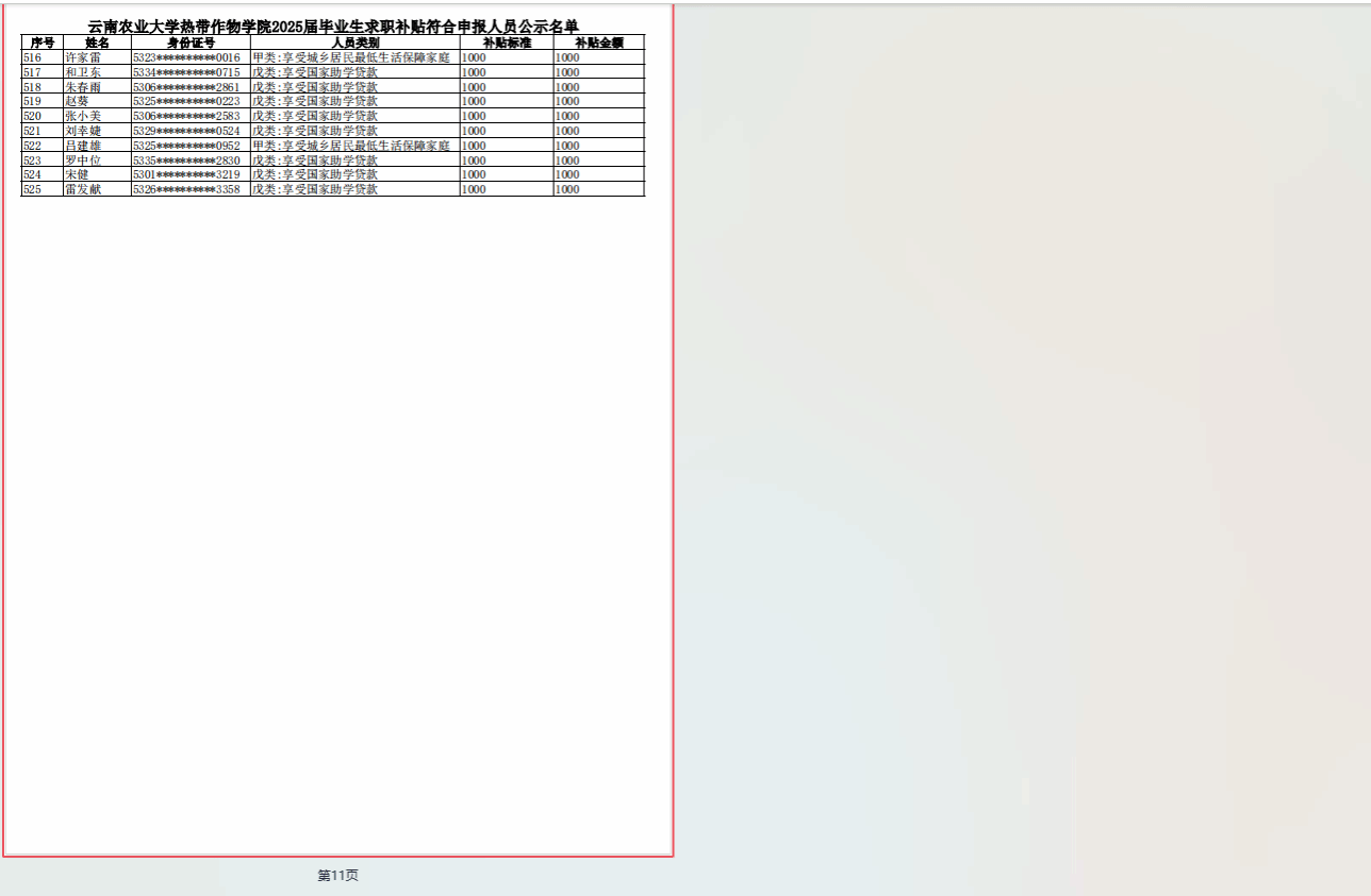 根据财政部人力资源社会保障部关于印 发〈就业补助资金管理办法〉的通知》(财社〔2023〕181 号)、 《云南省人力资源和社会保障厅 云南省教育厅 云南省财政 厅 云南省公安厅 云南省民政厅 云南省农业农村厅 云南 省残疾人联合会关于做好高校毕业生一次性求职补贴发放工作 的通知》(云人社通〔2024〕17号)文件要求,学院认真贯彻落实高校毕业生求职创业补贴申请专项工作,现将2025届毕业生求职补贴符合人员申报公示名单公示如下(见附件),公示期自即日起五个工作日,公式无误后报普洱市公共就业和人才服务中心审核批准。凡对以上结果存在异议,请以实名制书面形式向学生科反应,联系电话0879-3028687。