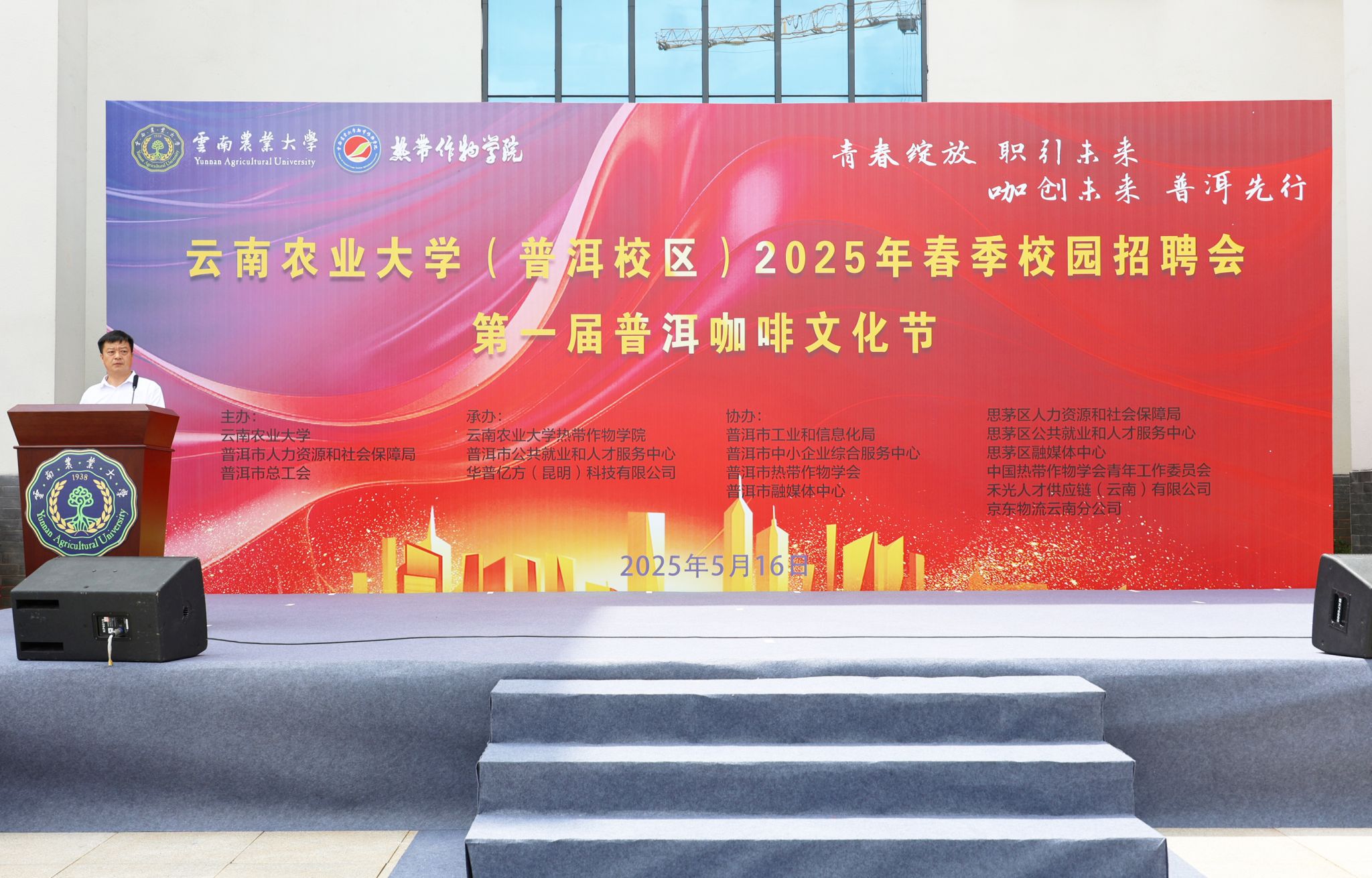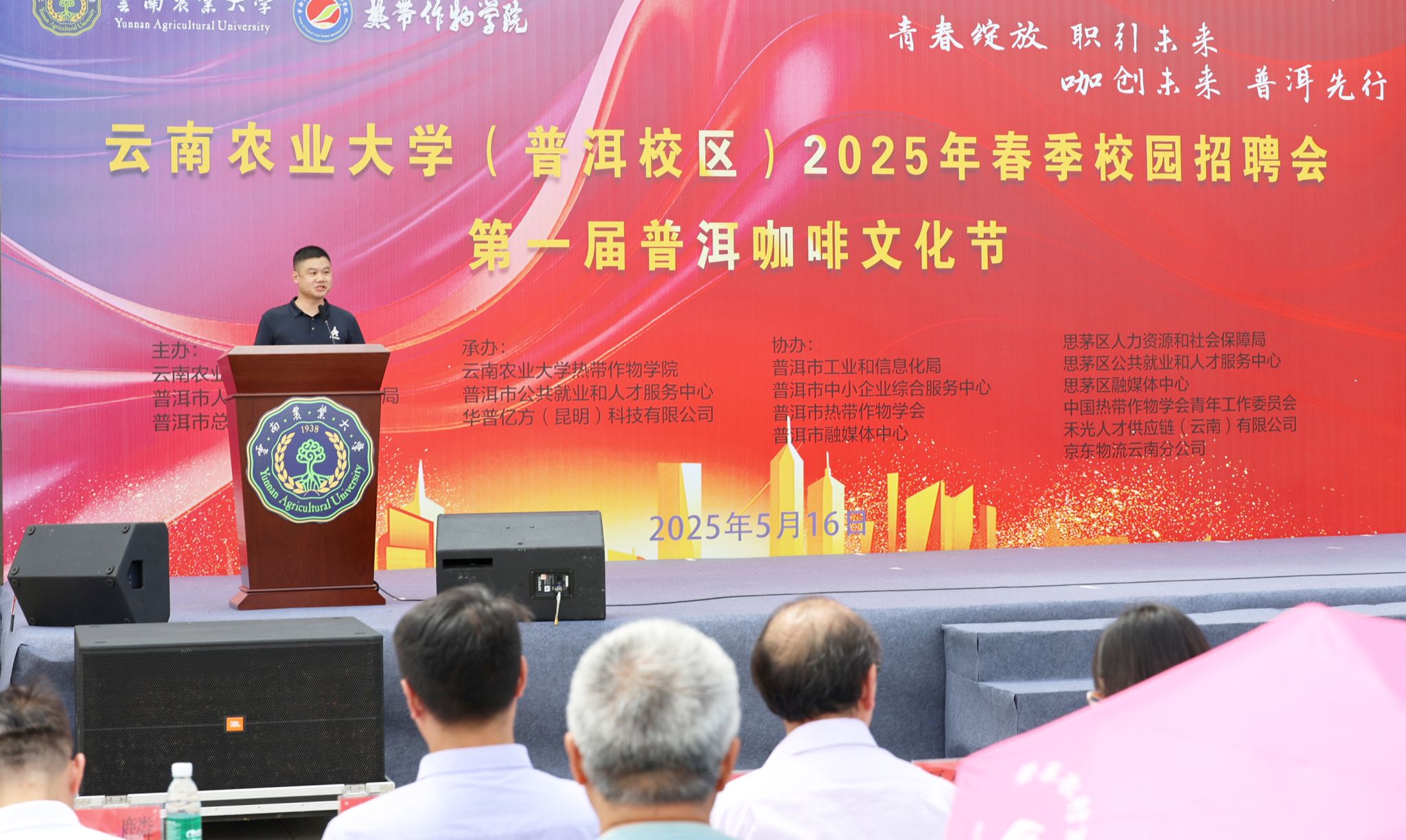 2025年5月16日,由云南农业大学、普洱市人力资源和社会保障局、普洱市总工会联合主办的 2025年春季校园招聘会暨第一届普洱咖啡文化节在热带作物作物学院正式开幕,普洱市副市长别燕妮,云南农业大学纪委书记陈文,普洱市人社局党组书记、局长曹刚等领导出席活动,60余家市级单位、139家企业共同参与活动。活动由bat365中文官方网站书记杜华波主持。