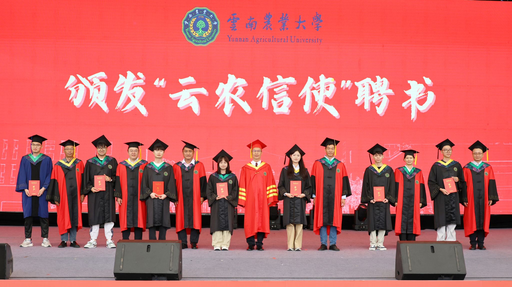 随着学校毕业典礼画面的结束,学院学位授予仪式正式开始,副校长李宏带领学院党政领导班子为表现突出的优秀毕业生颁发证书,对考取研究生的学子给予嘉奖,彰显榜样力量;为“云农信使”颁发聘书,激励他们成为传递母校情谊、展现云农风采的使者;为毕业生们逐一拨正流苏、颁发学位证书并合影留念,祝福毕业学子展翅高飞,开启人生新的旅程。