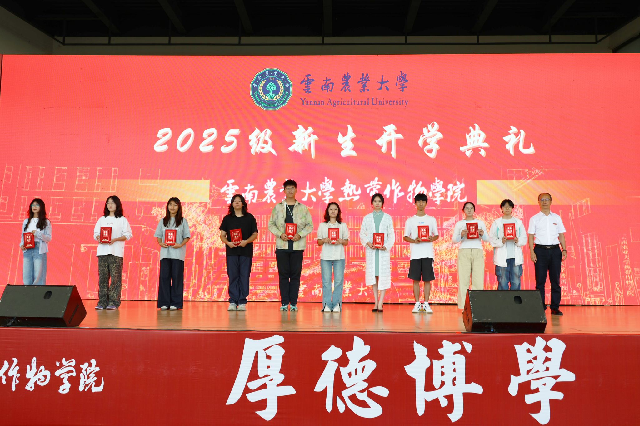 开学典礼上,参会领导为新生代表佩戴校徽,这枚校徽不仅是云农人的身份象征,更意味着云南农业大学办学精神的传承与弘扬,还对获得学院“五育之星”称号的10名学生进行了颁奖。