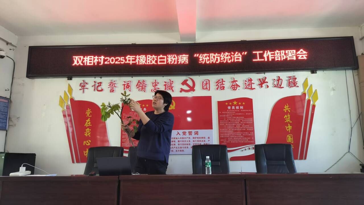 双相村党委书记叶恩在会上传达了孟连县“统防统治”启动会议精神,并结合本村实际,从防治区域划分、人员分工及时间节点等方面对具体工作进行了安排部署。杜华波书记指出,白粉病是威胁橡胶树生长的关键病害,直接影响胶农收入。他强调,学院将以国家天然橡胶产业技术体系为依托,在双相村建设橡胶先进技术示范基地,推动病虫害防控技术落地,助力胶农增产增收,以产业振兴巩固脱贫攻坚成果。