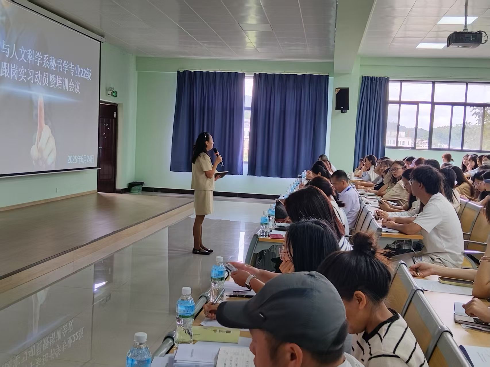 为扎实推进22级秘书学专业的实习工作,全面提升学生的实践能力与职业素养,旅游与人文科学系于2025年6月24日组织召开实习动员暨培训会议。此次会议旨在明确实习目标、规范实习流程、强化安全意识,帮助学生以更充分的准备迎接实习挑战。