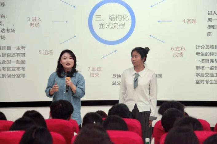 讲座中,刘璐老师结合自身多年面试教学经验,围绕面试礼仪、答题技巧、着装规范等方面展开了详细分享。她强调,面试不仅注重考察“内在实力”,也同样关注考生所展现的“外在风采”。在礼仪方面,刘璐老师详细讲解了敲门、坐姿、手势等细节规范,提醒同学们保持自然得体的仪态;在答题技巧上,她介绍了“总分结构”的表达方法,并建议同学们通过观看《主播说联播》来学习并提升语言表达能力。此外,刘璐老师还结合无领导小组讨论的实例,强调了发言、计时、总结陈词等环节的重要性。