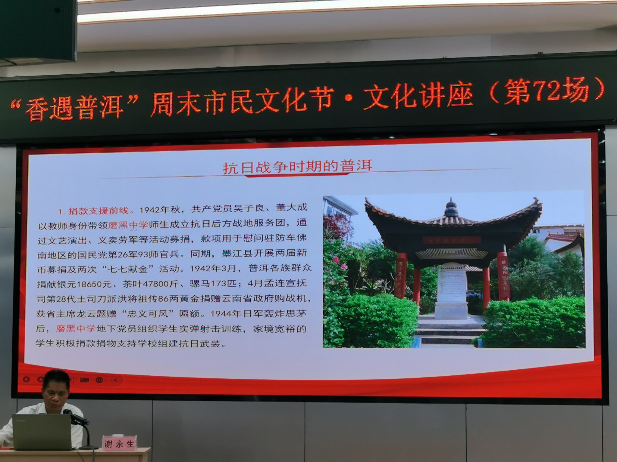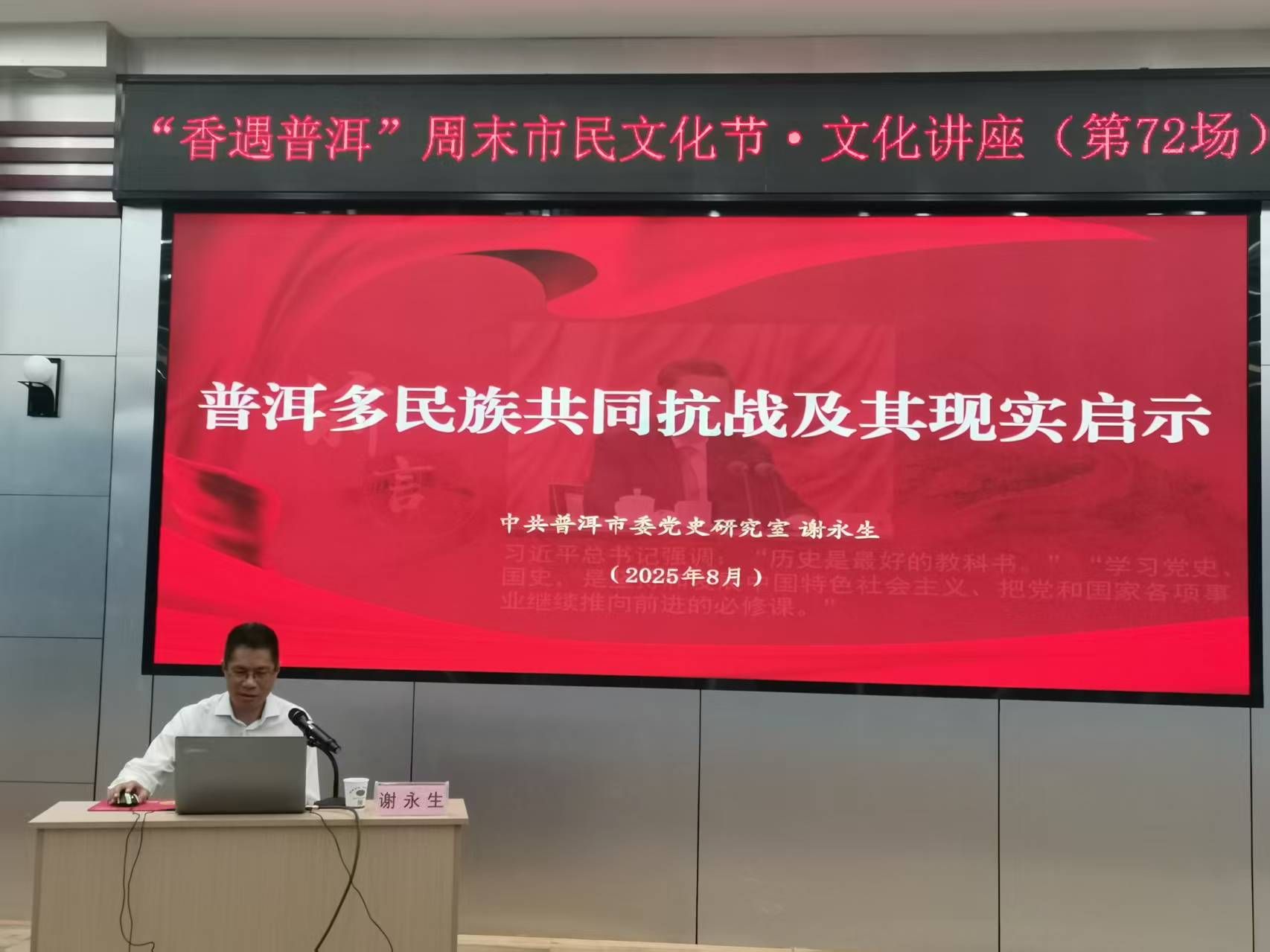 为纪念中国人民抗日战争暨世界反法西斯战争胜利80周年,引导广大民众铭记历史、缅怀先烈、珍爱和平、开创未来,2025年8月30日,“香遇普洱”周末市民文化节・文化讲座在普洱市图书馆举行。本次讲座特邀普洱市委党史研究室主任、市委宣讲团成员谢永生担任主讲,主题为“纪念中国人民抗日战争暨世界反法西斯战争胜利80周年,普洱多民族共同抗战及其现实启示”。