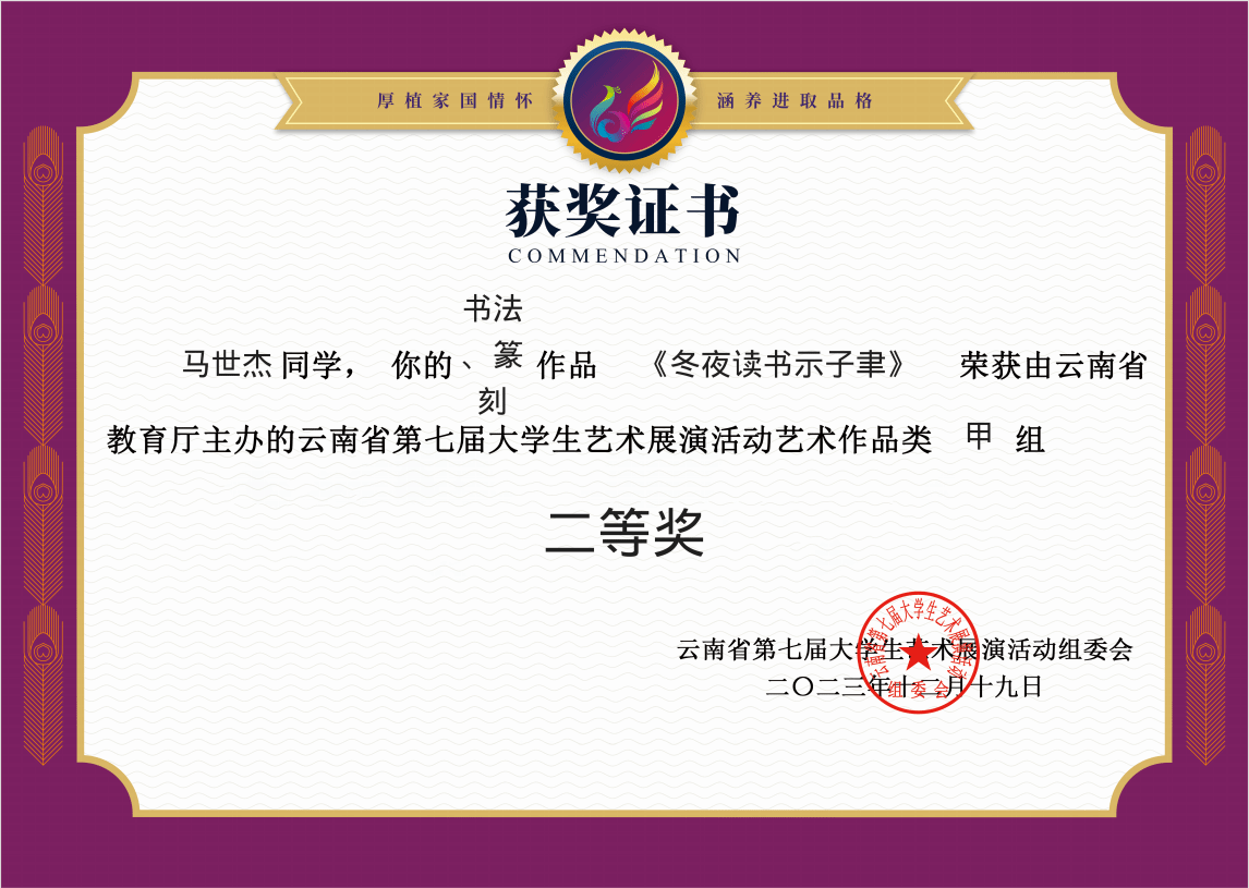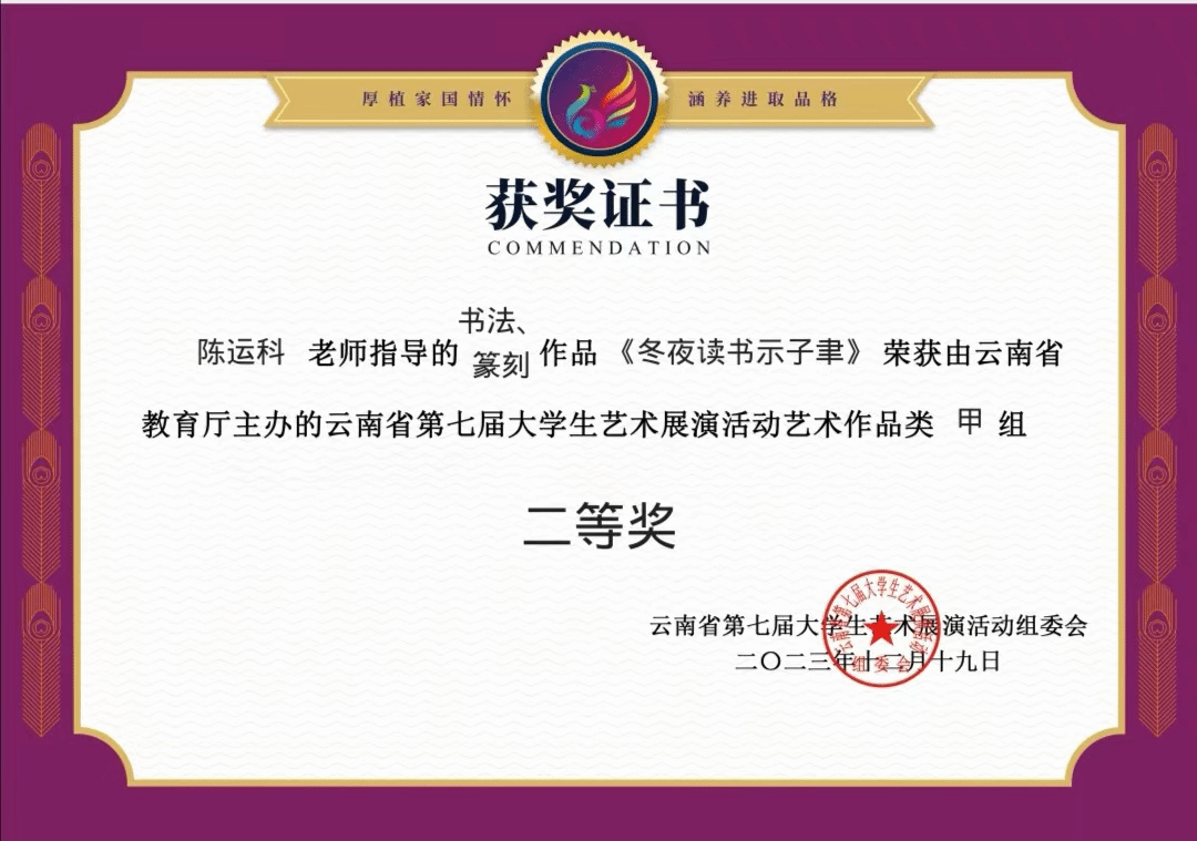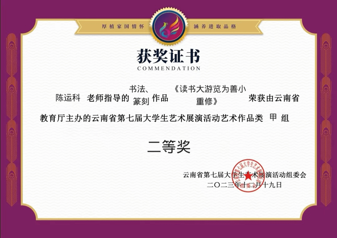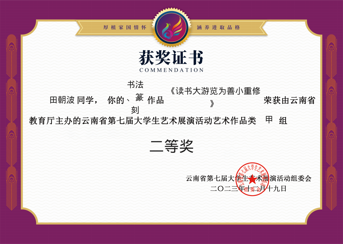 由云南省教育厅主办的第七届大学生艺术展演获奖名单揭晓,我院首次参加赛事创佳绩。据了解,本次赛事共有72所高校参加,共报送艺术表演类节目336个、艺术作品1597幅、美育改革创新优秀案例126篇、艺术工作坊88个。我院在本次赛事中共报送书法作品7幅,其中田朝波和马世杰同学的个人书法作品荣获二等奖,陈运科老师获得指导教师二等奖两项。