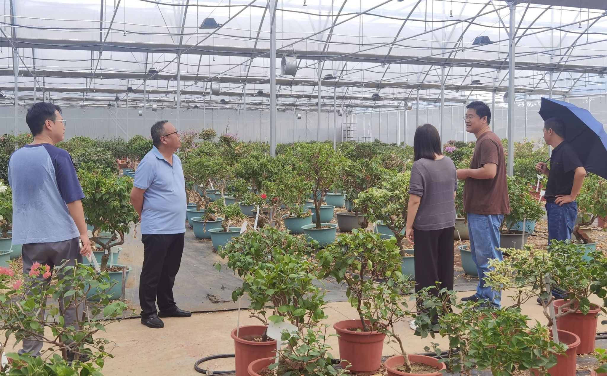 9月17日,团队前往儋州品种资源研究所,与所内热带花卉实验室的研究人员(含我方实习学生)展开深入交流,围绕朱顶红、三角梅、红掌等品种在园林观赏方向的应用进行了学术探讨,并实地参观了研究所的花卉栽培大棚,深入考察了其新品种培育成果。