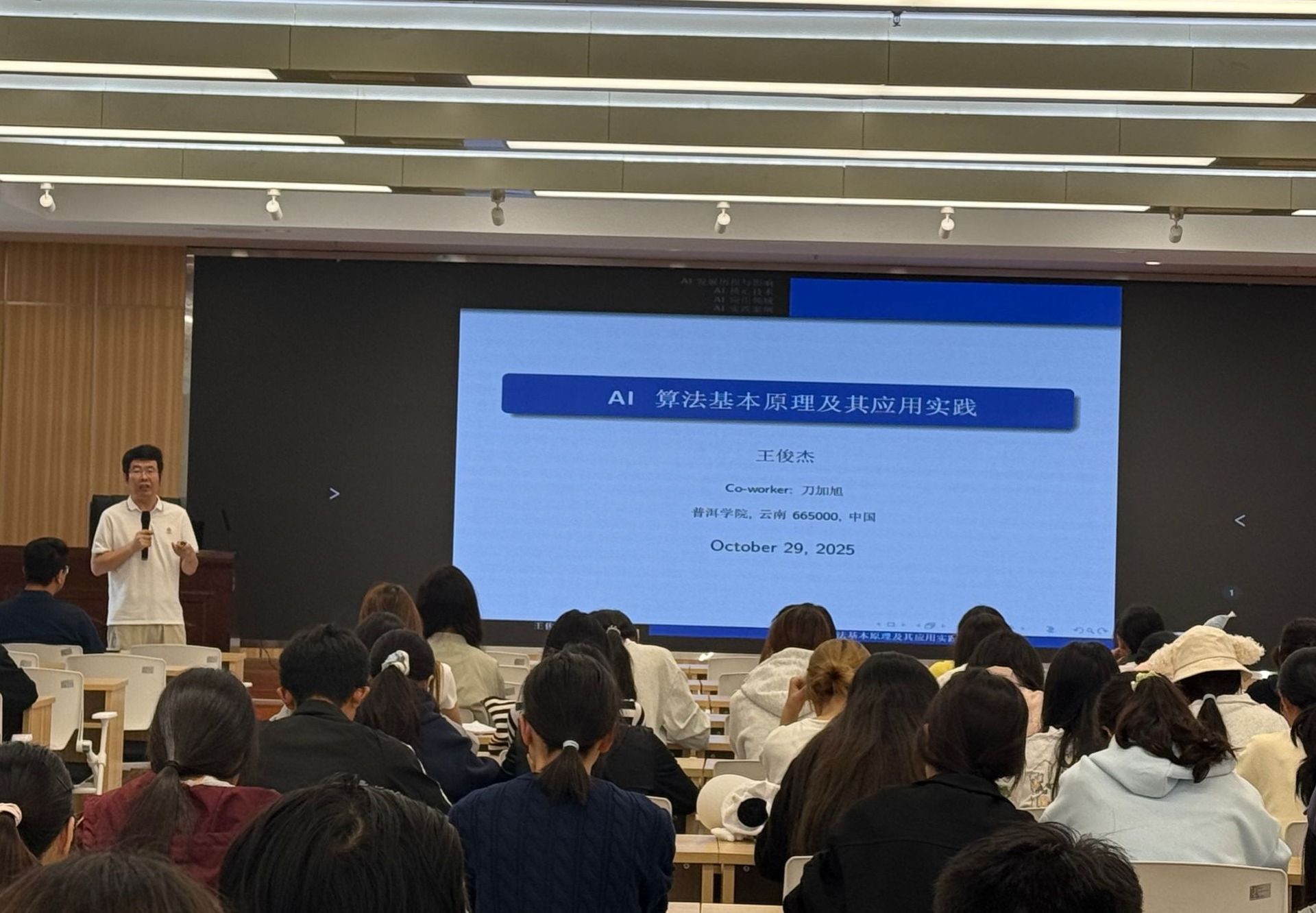 为助力师生紧跟 AI 技术发展前沿,园林与建筑工程系于 2025 年 10 月 29 日在图书馆报告厅,特别邀请普洱学院科技处处长王俊杰教授和理工学院专任教师刀加旭老师,分别围绕 “AI 算法基本原理及其应用实践” 与 “AI 辅助编程实践:基于深度学习的茶叶病害图像分类” 主题举办专题讲座。这两场讲座吸引了园林与建筑工程系数百名师生到场聆听,现场洋溢着浓厚的学术氛围。