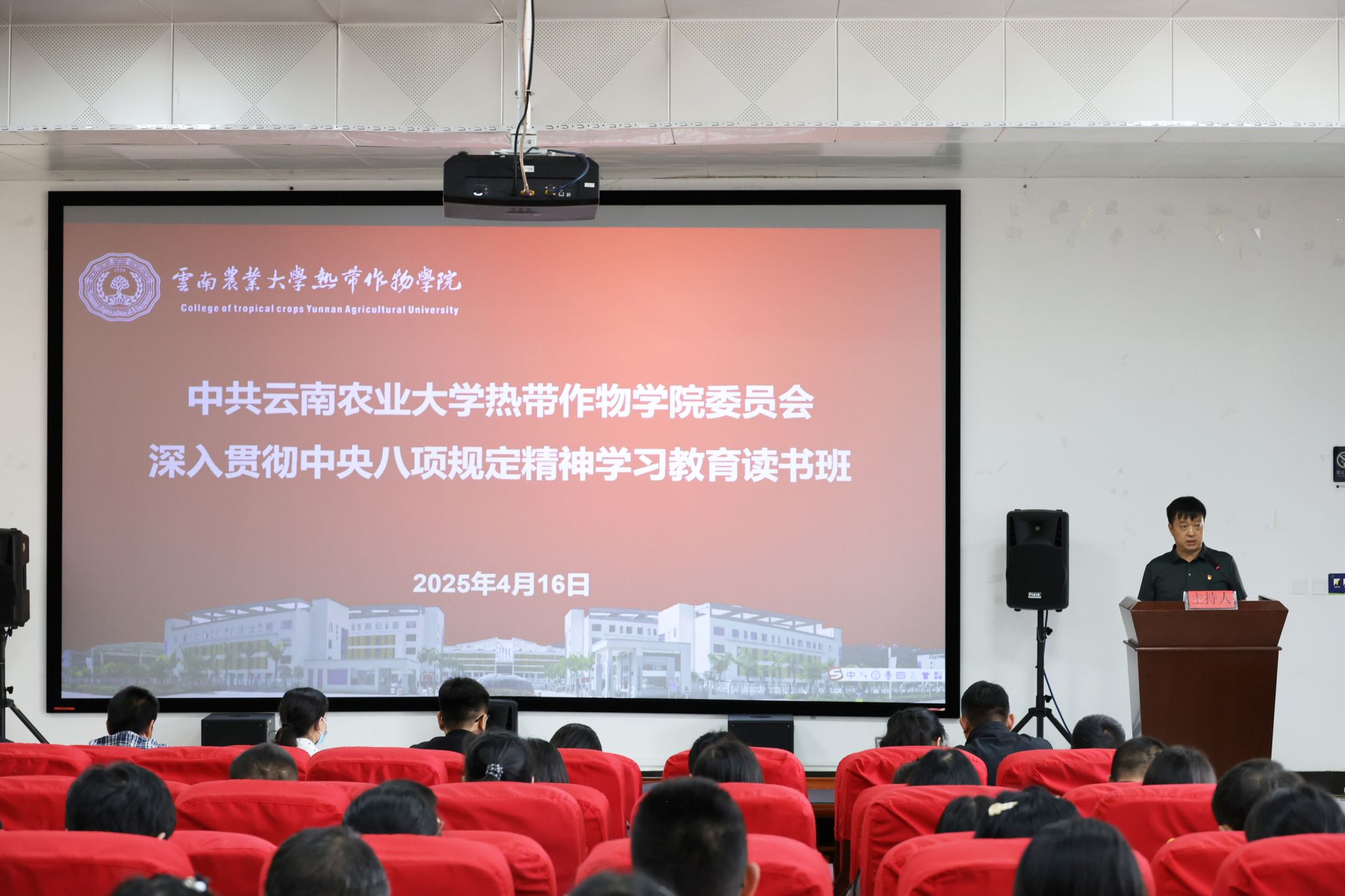 2025年4月16日,在深入贯彻中央八项规定精神学习教育读书班动员会上,热带作物bat365中文官方网站书记杜华波作开班动员讲话,并传达学校深入贯彻中央八项规定精神学习教育启动部署会议精神;纪委书记闫刚通报违反中央八项规定及其实施细则精神典型案例;党委组织员、工会主席周兴明组织学习《中共中央政治局贯彻落实八项规定实施细则》。