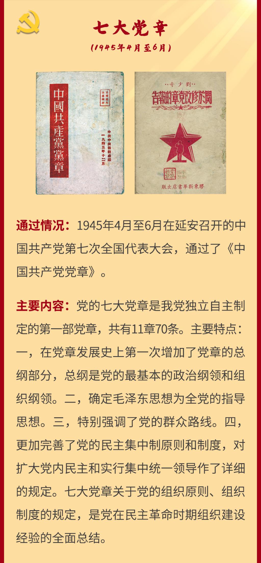 党章是党的总章程。党的全国代表大会根据理论创新和实践创新的需要对党章进行修改,是我们党的一个惯例。党的二十大根据新形势新任务对党章进行了适当修改,于2022年10月22日通过了关于《中国共产党章程(修正案)》的决议。党建网依据相关材料整理了从党的一大到二十大党章历次制定与修正的“极简史”,邀您一起学习了解。