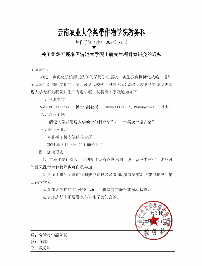 上一条:热作学院(教)〔2024〕37号 关于组织申报2024年学生出国(境)学历提升、实习预报名的通知 下一条:热作学院(教)〔2024〕27号关于组织参加马来西亚玛尼帕尔国际大学专家讲座的通知