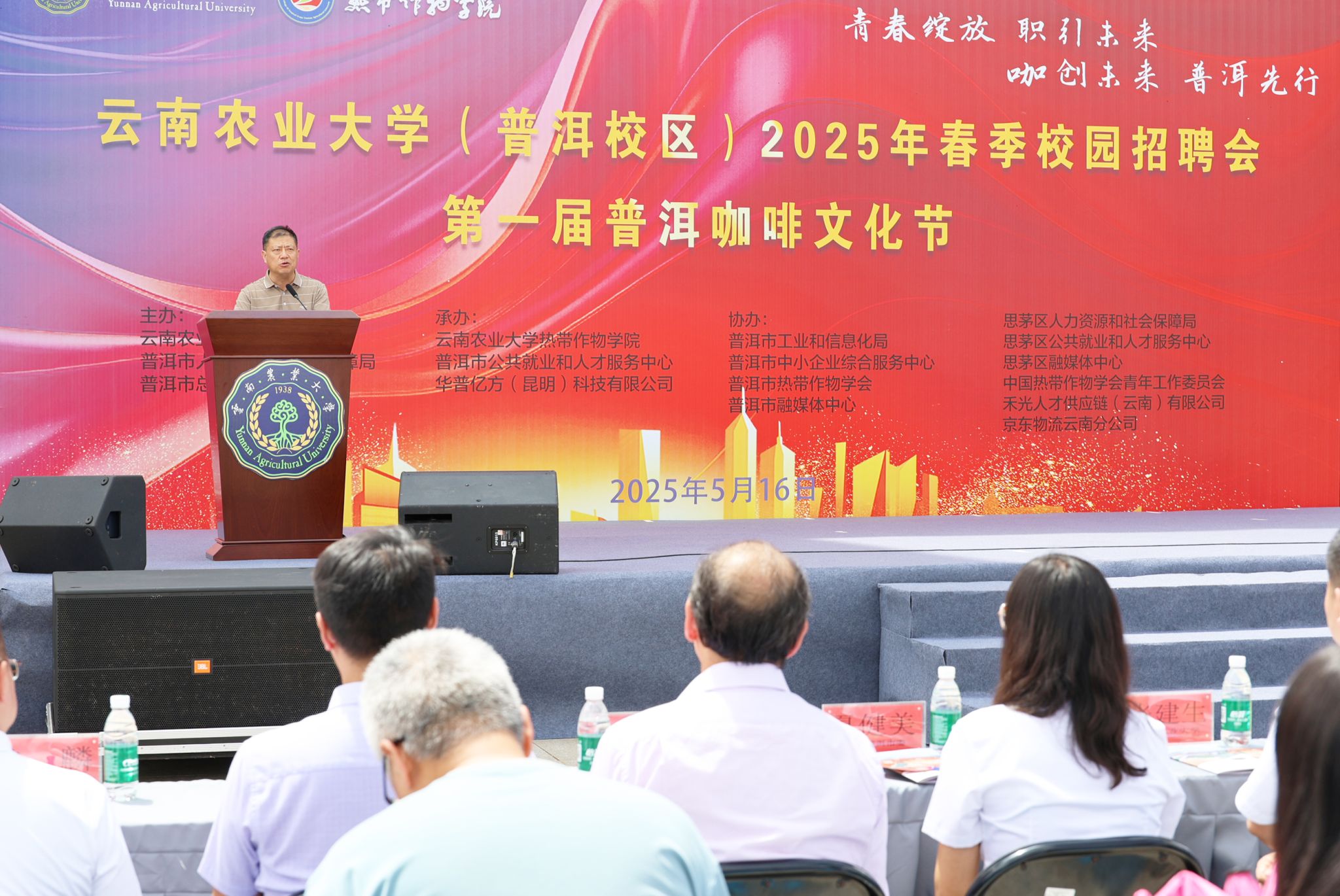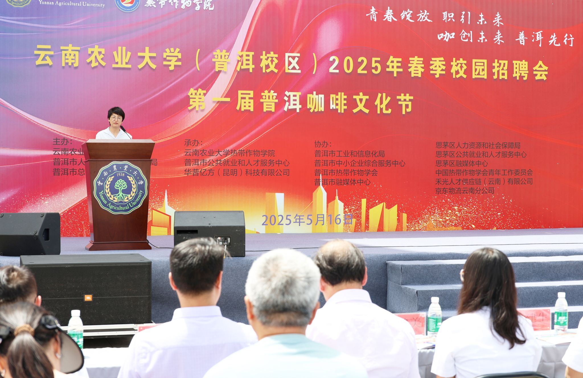 2025年5月16日,由云南农业大学、普洱市人力资源和社会保障局、普洱市总工会联合主办的 2025年春季校园招聘会暨第一届普洱咖啡文化节在热带作物作物学院正式开幕,普洱市副市长别燕妮,云南农业大学纪委书记陈文,普洱市人社局党组书记、局长曹刚等领导出席活动,60余家市级单位、139家企业共同参与活动。活动由bat365中文官方网站书记杜华波主持。