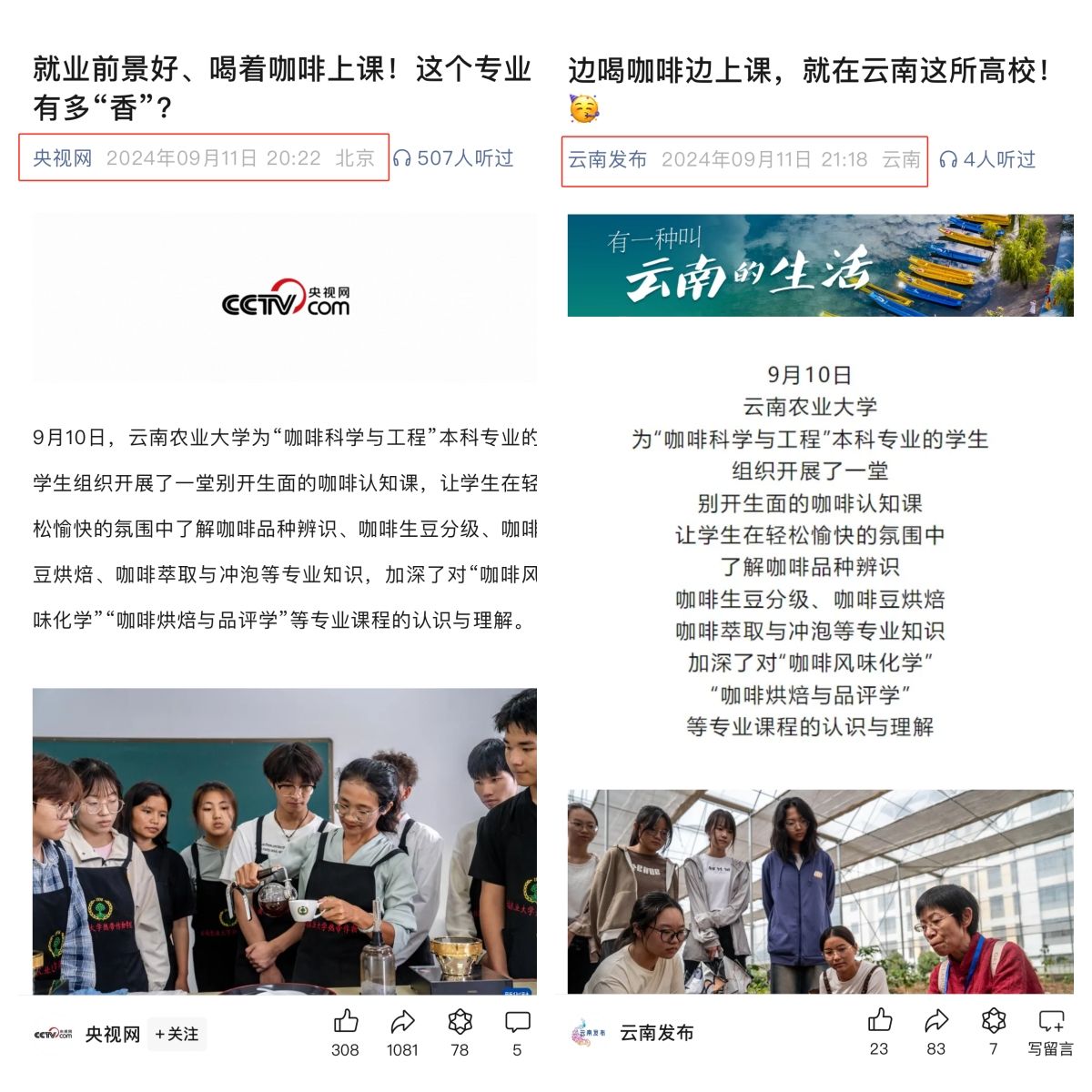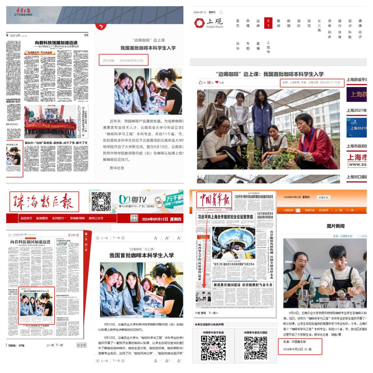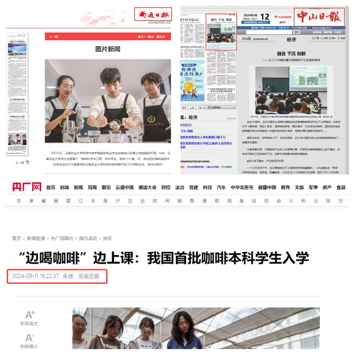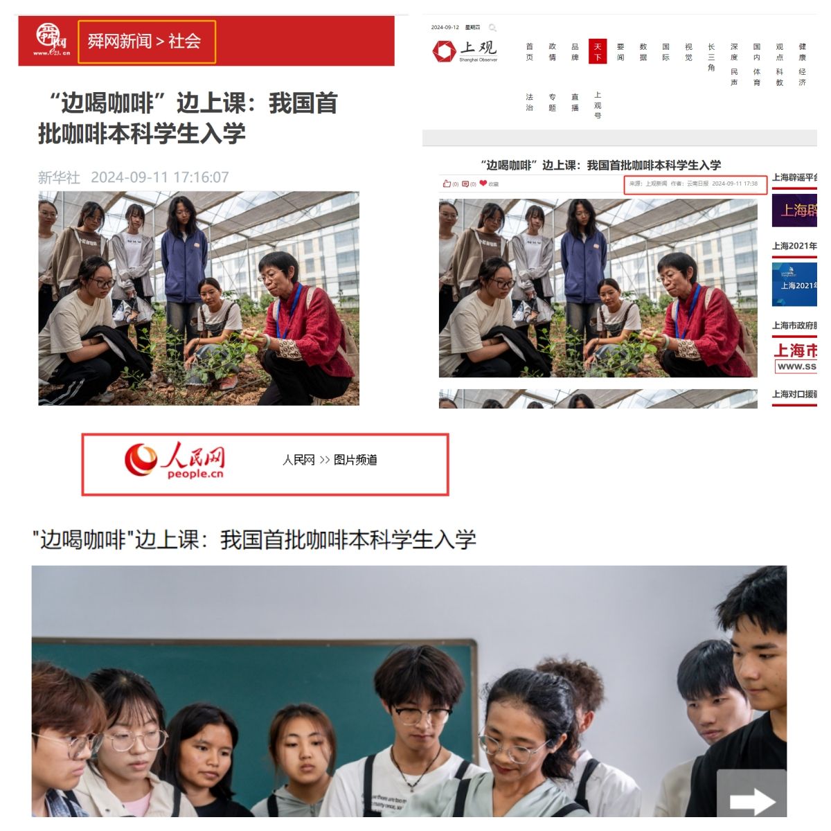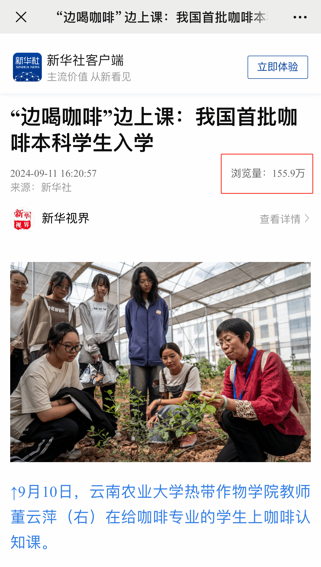 2024年9月11日,新华社以《“边喝咖啡”边上课:我国首批咖啡本科学生入学》为题,对云南农业大学“咖啡科学与工程”专业进行了报道。截至48小时内,该篇报道阅读量已突破155万。