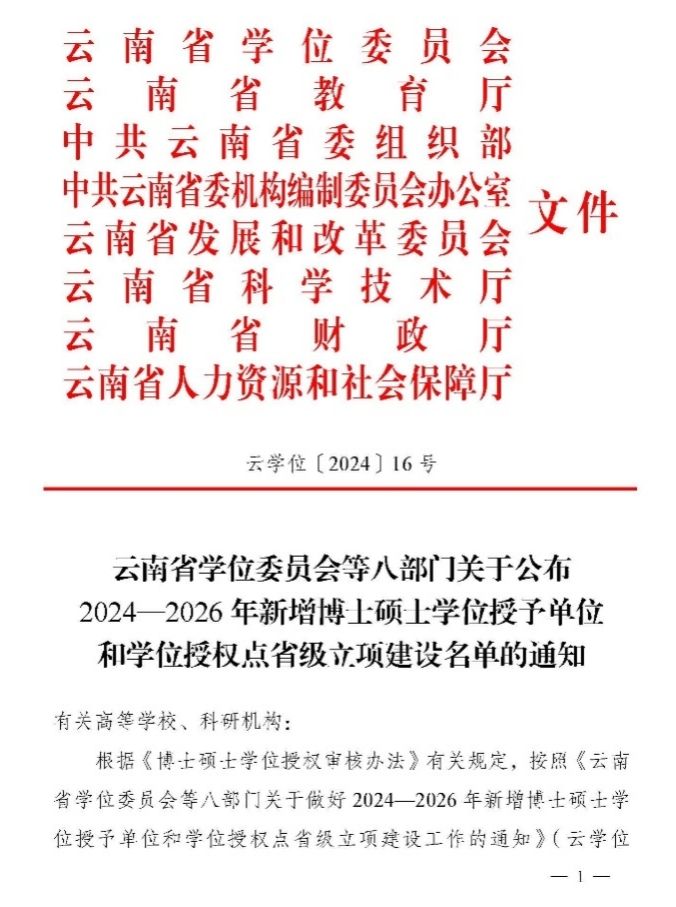 根据《云南省学位委员会等八部门关于公布2024—2026年新增博士硕士学位授予单位和学位授权点省级立项建设工作的通知》相关要求,bat365中文官方网站认真研读相关文件精神,精心组织开展申报工作。经云南省学位办组织评议,学院申报的林业专业博士获云南省新增博士学位授权点省级立项建设,标志着学院林学学科发展步入新的台阶。