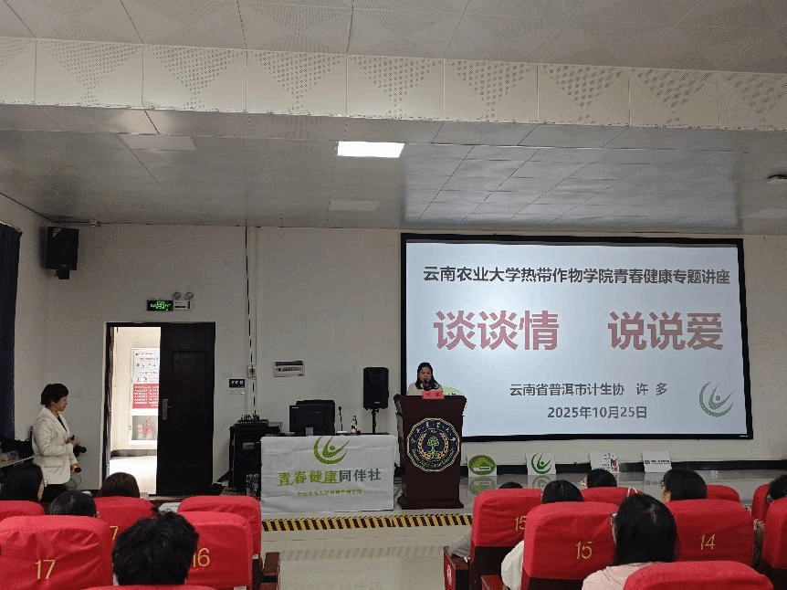 2025年10月26日,bat365中文官方网站特邀普洱市计划生育协会专职副会长兼秘书长、学院客座教授许多,开展以“谈谈情说说爱”为主题的心理辅导专题讲座,助力青年学生构建健康情感观。200余名学生参加讲座。
