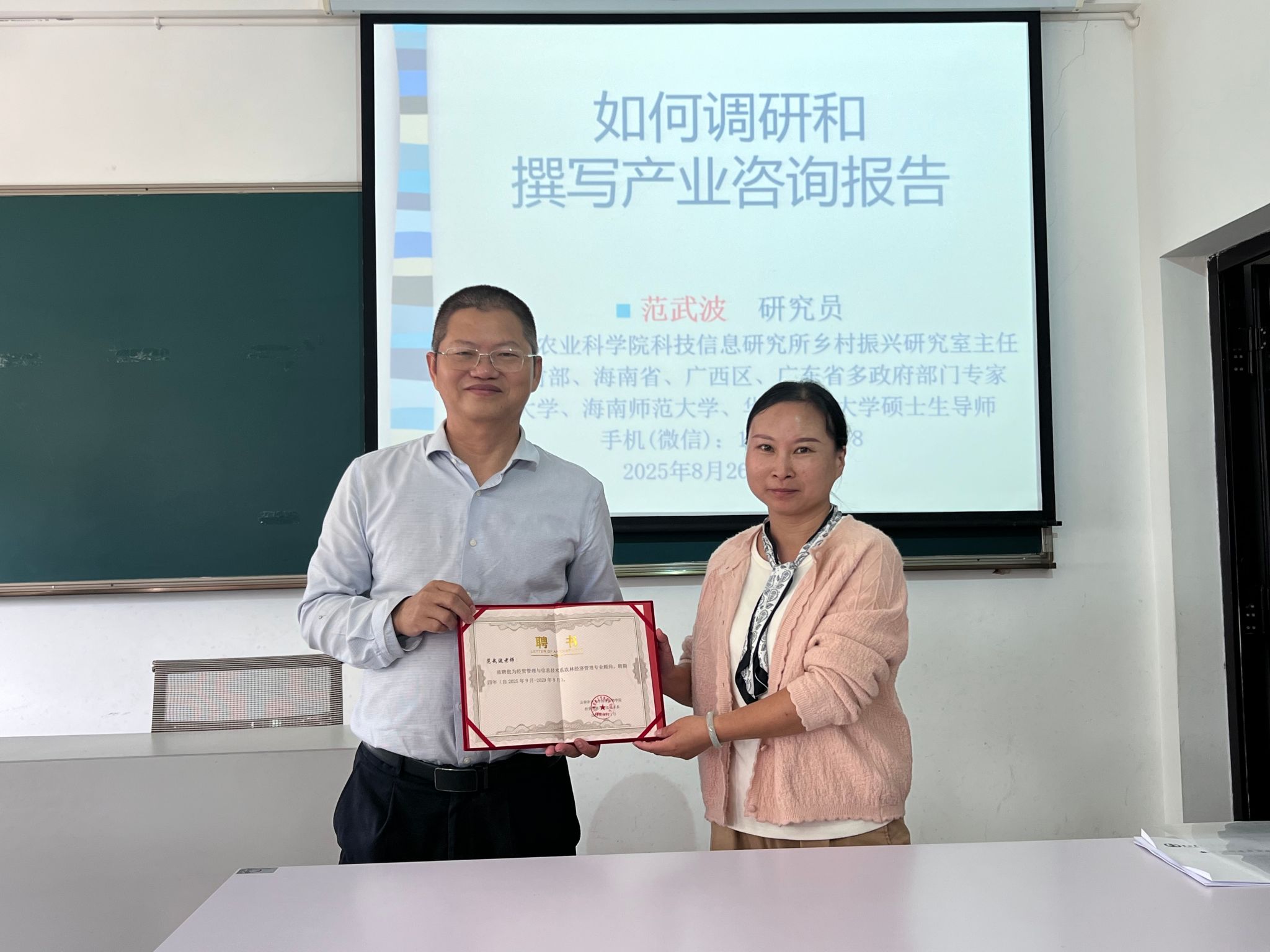 讲座尾声,范武波研究员介绍了“乐活产业”发展理念,分享业务沟通的不同版本技巧,并开放交流答疑。同时,经贸管理与信息技术系副主任吴光凤为范武波研究员颁发聘书,聘请范武波研究员担任农林经济管理专业顾问,并与农林经济管理专业教师合影。