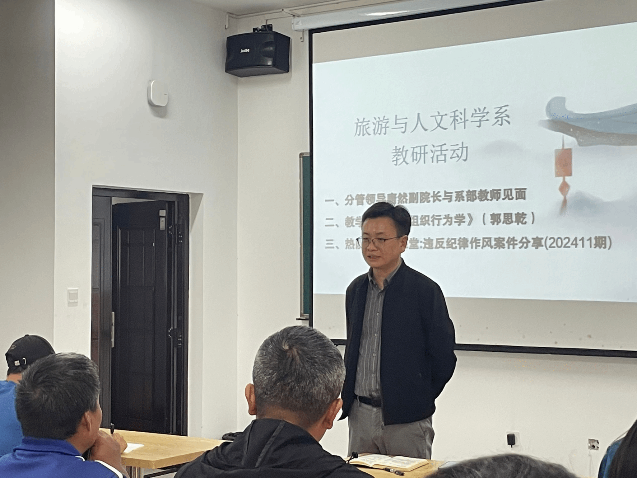 2024年11月20日下午,副院长唐然参加了旅游与人文科学系的教学会议,并与全体教师进行了亲切的交流,作为该系联系的院领导进行工作指导。