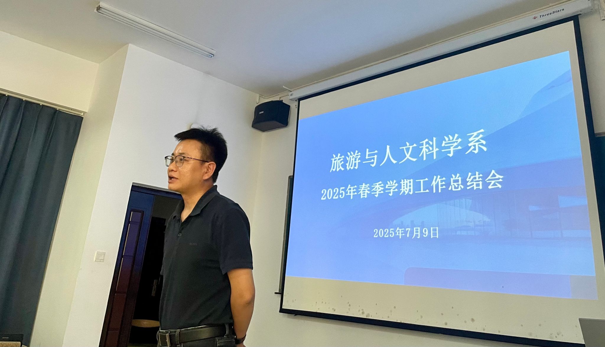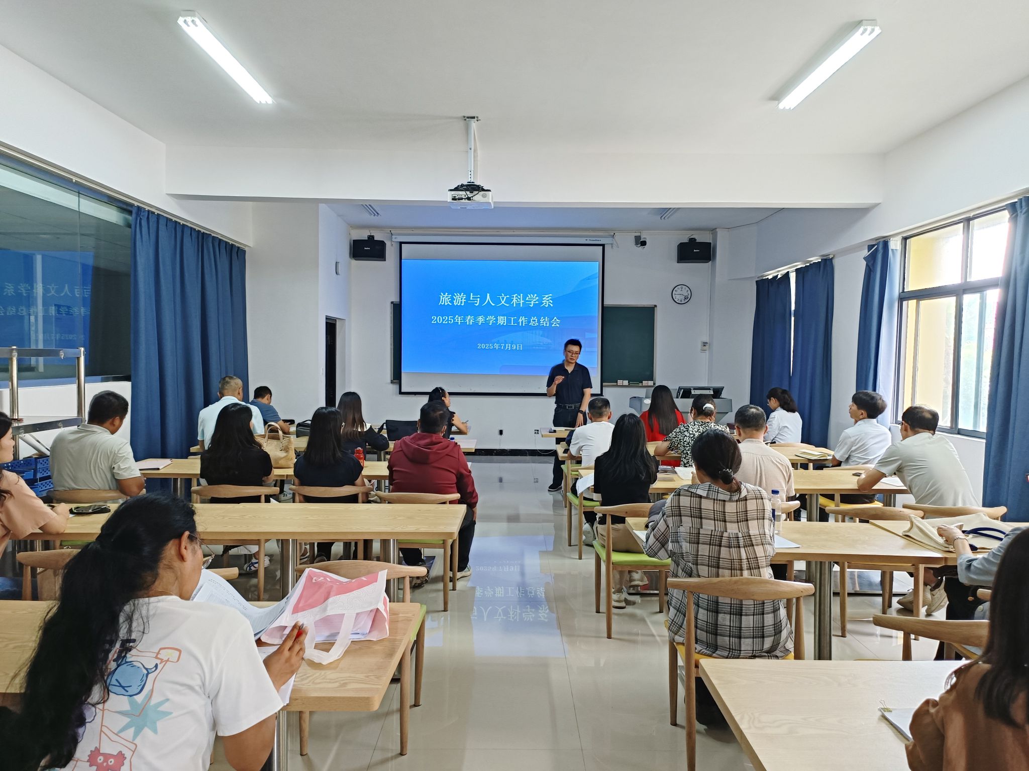 唐然副院长听取了总结汇报和大家的讨论发言,并发表了重要讲话。他首先对旅游与人文科学系本学期各项工作取得的成绩给予了充分肯定,并对全系教师的辛勤付出表示感谢。唐然副院长认为,旅游与人文科学系是一个具有温度、有氛围、有韧性、有态度的系部,同时针对“十五五”时期的发展,对系部老师提出了三个明确要求与殷切希望:一要坚持学习,每日积累提升履职精度;二要发扬韧劲,事不避难增强履职力度;三要换位思考,以人文关怀提升履职温度。 他强调,要以优良党风带动政风、教风、学风,将效能建设贯穿工作始终,多聚焦“重要但不紧急”的事,在学科建设、人才培养中实现新突破。唐然副院长的讲话为旅游与人文科学系的未来发展指明了方向,鼓舞了士气。系主任李昳华代表全系表示,将认真学习领会院领导指示精神,以此次会议为契机,扎实做好期末收尾工作,并组织力量深入研讨、精心编制“十五五”发展规划,凝心聚力,锐意进取,奋力开创旅游与人文科学系高质量发展新局面。