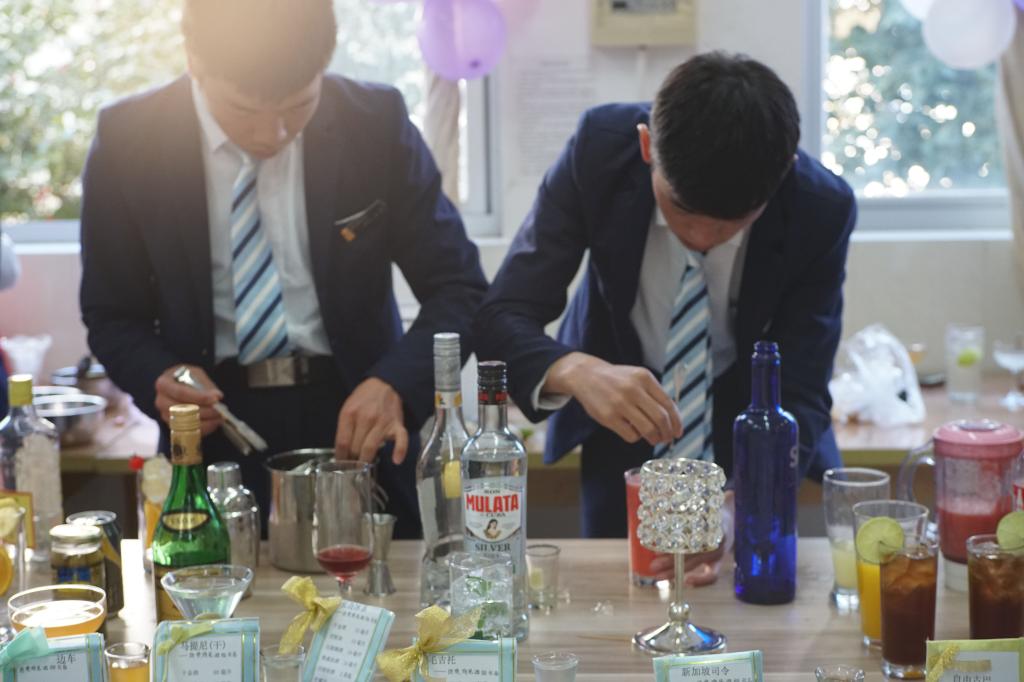 酒店管理与数字化运营专业学生在酒吧实训室进行鸡尾酒调制训练